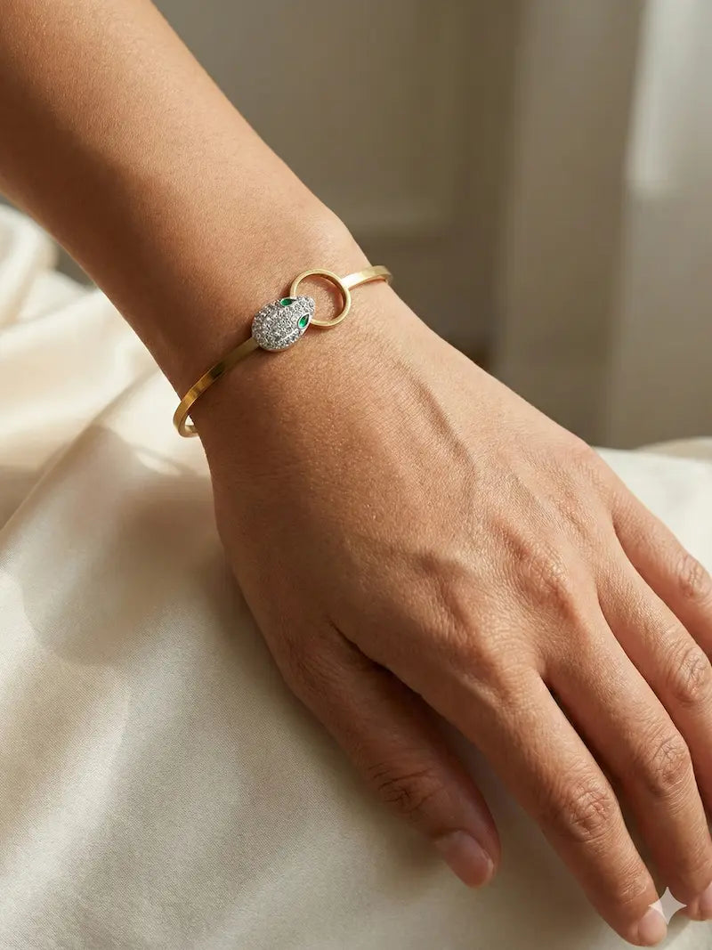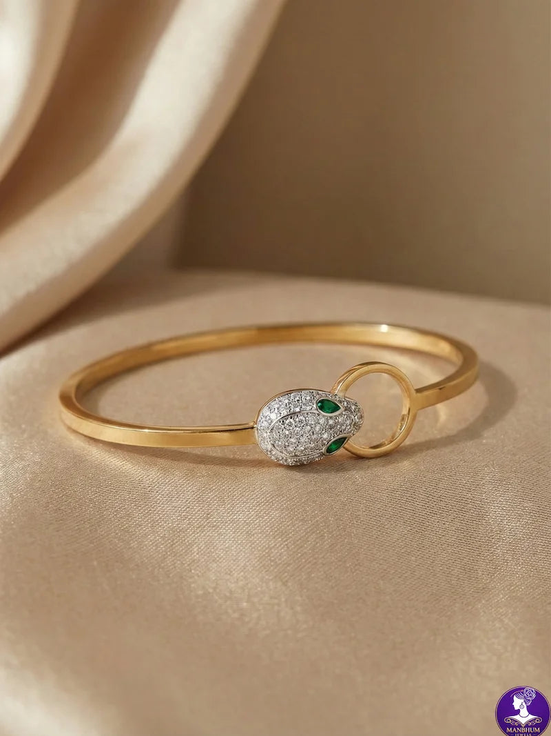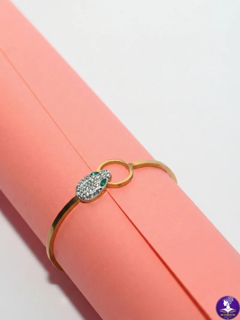 This Gold Tone Panther Design Crystal Bracelet is a luxurious and stylish jewellery piece designed for women who love bold and premium fashion. The bracelet features a sleek gold finish with a beautifully crafted panther head design, decorated with sparkling crystal stones and elegant green eye detailing, giving it a rich and eye-catching look.